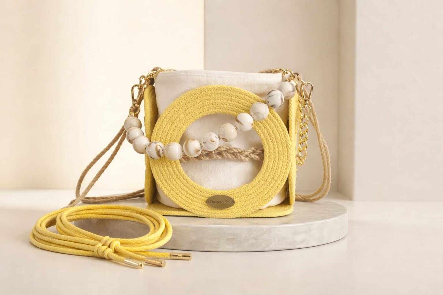 The Tiffany Bag features a sleek silhouette in eco-friendly rope cord, with optional decorative elements like pearls or charms — making each piece truly unique.